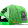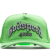 The GS Forever Trucker Hat from Godspeed New York has a classic construction with an A-frame crown and mesh panels. The lime washed green snapback showcases embroidered graphics throughout, and includes three pins.