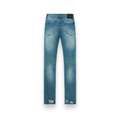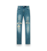 The Bryant Skinny Jean in Blue Distressed Snake is made from premium denim designed with a skinny fit and reinforced stitching on the inner thighs. These jeans feature the RTA logo and distressed detailing on the front and back legs with snake print peeking through the rips, a chrome cross emblem on the corner of the front pocket, the iconic RTA cross on the back pocket, and signature leather patch on the back waistband.